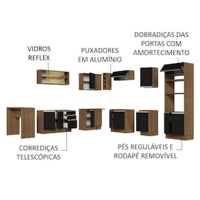 Por fim, a cozinha conta ainda com pés reguláveis em PVC e rodapé removível em MDP de fácil encaixe, para retirar na hora de realizar a limpeza.
