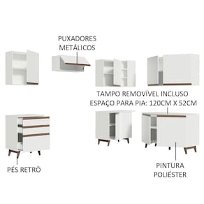 O espaço interno e externo é ótimo e você pode organizar todos os utensílios e aparelhos da cozinha. Todos os balcões acompanham tampo em MDP, que pode ser removido para colocação de pia e/ou cooktop.