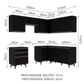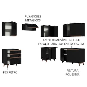 O espaço interno e externo é ótimo e você pode organizar todos os utensílios e aparelhos da cozinha. Todos os balcões acompanham tampo em MDP, que pode ser removido para colocação de pia e/ou cooktop.