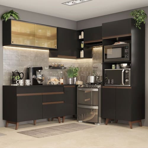 Por seu tamanho, é perfeita para organizar toda louça, utensílios e eletros. Além disso, todos os balcões acompanham tampo em MDP, que podem ser removidos para colocação de pia e/ou cooktop. A torre quente comporta forno e micro-ondas e possui abertura para dissipação do calor.
