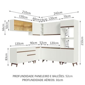 Os materiais utilizados na fabricação são da melhor qualidade, como puxadores embutidos em alumínio, dobradiças metálicas e gaveta com corrediças de metal. Além disso, os pés em madeira e o aéreo com portas em vidro reflex trazem ainda mais beleza ao seu ambiente.