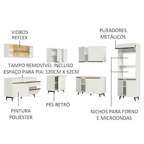 Um dos grandes destaques desta cozinha é o espaço interno e externo, perfeito para organizar os utensílios e aparelhos da cozinha. Todos os balcões acompanham tampo em MDP, que podem ser removidos para colocação de pia e/ou cooktop e a torre comporta forno e micro-ondas.