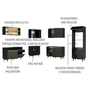 Um dos grandes destaques desta cozinha é o espaço interno e externo, perfeito para organizar os utensílios e aparelhos da cozinha. Todos os balcões acompanham tampo em MDP, que podem ser removidos para colocação de pia e/ou cooktop e a torre comporta forno e micro-ondas.