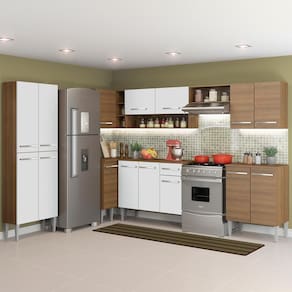 A Cozinha Completa Emilly de Canto Reto é a solução ideal para o seu dia-a-dia. Possui puxadores com alumínio e corrediças e dobradiças metálicas resistentes. Conta com 15 portas, 1 gaveta e 5 nichos proporcionando amplos espaços. Acompanha tampo de madeira de todos os balcões. Os pés são em PVC para facilitar a limpeza e reguláveis para nivelar pequenas imperfeições no piso.