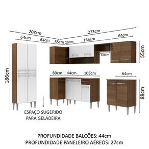 Medidas totais: 186 cm de altura, 208 cm de largura do lado esquerdo - contando o espaço sugerido para a geladeira de 64 cm - e 273 cm de largura do lado direito, contabilizando o espaço necessário para o canto. São 44 cm profundidade nos balcões inferiores e 27 cm no paneleiro e nos aéreos.