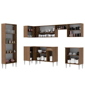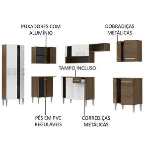 O acabamento interno e externo é nas cores amadeirado Rustic e branco, em Pintura Poliéster com 7 camadas de proteção que oferece resistência contra os efeitos da água e do calor. Ela é dividida em sete módulos independentes: paneleiro duplo de quatro portas, balcão de canto reto, armário aéreo de canto reto com duas portas e adega, balcão de pia, armário aéreo com duas portas e dois nichos, balcão com 2 portas e armário aéreo com 2 portas.