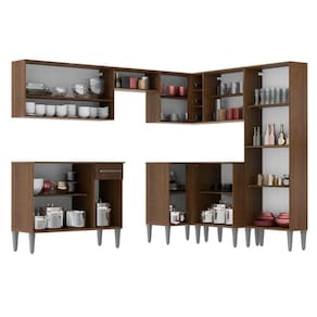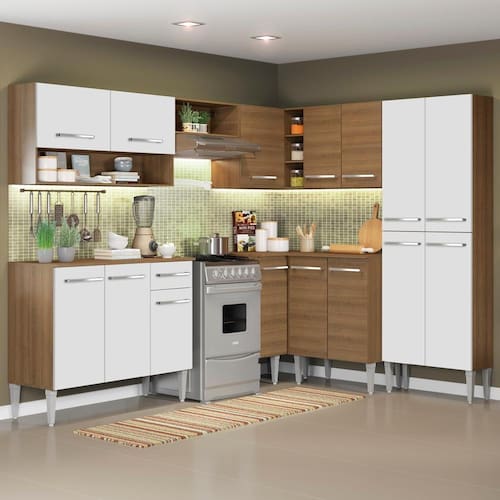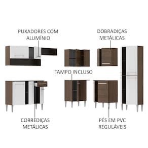 A Cozinha Emilly de Canto Reto se destaca por ser completa e ideal para o seu dia-a-dia. Conta com 15 portas, 1 gaveta e 5 nichos com puxadores com alumínio e corrediças e dobradiças metálicas resistentes. Acompanha tampo de madeira de todos os balcões. Os pés são em PVC para facilitar a limpeza e reguláveis para nivelar pequenas imperfeições no piso.