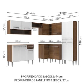 Medidas totais: 186 cm de altura, 245 cm de largura do lado esquerdo e 172 cm de largura do lado direito, contabilizando o espaço necessário para o canto. São 44 cm profundidade nos balcões inferiores e 27 cm no paneleiro e nos aéreos.
