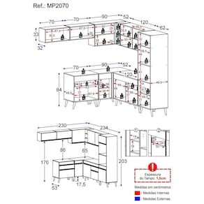 Dimensões do produto montado: Altura: 203cm | Largura: 230 x 234cm | Profundidade: 32cm (aéreos) - 53cm (balcão com tampo e paneleiro) *Você pode consultar as medidas internas na imagem técnica do produto.