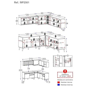 Produto Composto Por: 1 Armário Aéreo Com Portas de Vidro 120cm, 1 Armário Aéreo de Canto 90cm, 1 Armário Aéreo 150cm, 1 Balcão Com Tampo 120cm, 1 Balcão Com Tampo de Canto 90cm, 1 Balcão Com Tampo 150cm, Manual de Montagem E. Kit Ferragem.