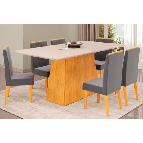 Sala de Jantar Completa Dulce Tampo Madeirado c/ Vidro Reto 180x90cm e 6 Cadeiras Lia Cedro/Off White - Suede Lunar - DJ Móveis Abaixo segue os produtos do KIT: Sala de Jantar Completa Dulce Tampo Madeirado c/ Vidro Reto 180x90cm e 6 Cadeiras Lia Cedro/Off White - Suede Lunar - DJ Móveis