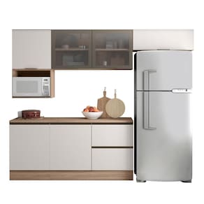 Cozinha Modulada Completa 6 peças 6 portas 3 gavetas com portas vidro fumê Etna é um produto com toda praticidade e elegância para seu ambiente. Possui módulos amplos com prateleiras, nicho para micro-ondas A.39 x L.55 x P.45cm., aéreo duplo com portas molduradas com vidro fumê, aéreo geladeira com pistão a gás, balcões com tampo de espessura 27mm, resistente a riscos, umidade e altas temperaturas, balcão com gaveta embutida com porta talher incluso, dobradiças reforçadas de 35mm com a função slow motion possibilitando um fechamento mais suave, gavetas com corrediças telescópicas que permitem abertura total, puxadores modelo perfil em polímero preto nos balcões e puxadores de metal nos aéreos, pés em PVC 14,5cm reguláveis ao piso que permitem o nivelamento perfeito, também acompanha rodapés com presilhas modelo click que possibilitam a remoção dos mesmos. Conjunto composto por 6 itens: aéreo 1porta, nicho micro-ondas, aéreo 2portas vidro, aéreo geladeira, balcão 1porta com tampo, balcão 1porta 3gavetas com tampo. Produto em MDP com pintura UV acetinada, possibilitando melhores acabamento e resistência. Produto ecologicamente correto com embalagens preparadas para evitar avarias e permitir que o produto chegue em perfeito estado em sua casa. Perfeita combinação com os mais variados ambientes. Qualidade que só a Poliman oferece em seus produtos.