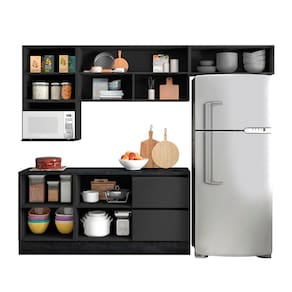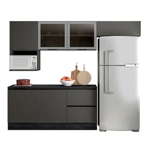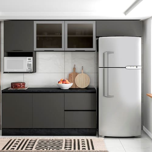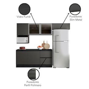 Cozinha Modulada Completa 6 peças 6 portas 3 gavetas com portas vidro fumê Etna é um produto com toda praticidade e elegância para seu ambiente. Possui módulos amplos com prateleiras, nicho para micro-ondas A.39 x L.55 x P.45cm., aéreo duplo com portas molduradas com vidro fumê, aéreo geladeira com pistão a gás, balcões com tampo de espessura 27mm, resistente a riscos, umidade e altas temperaturas, balcão com gaveta embutida com porta talher incluso, dobradiças reforçadas de 35mm com a função slow motion possibilitando um fechamento mais suave, gavetas com corrediças telescópicas que permitem abertura total, puxadores modelo perfil em polímero preto nos balcões e puxadores de metal nos aéreos, pés em PVC 14,5cm reguláveis ao piso que permitem o nivelamento perfeito, também acompanha rodapés com presilhas modelo click que possibilitam a remoção dos mesmos. Conjunto composto por 6 itens: aéreo 1porta, nicho micro-ondas, aéreo 2portas vidro, aéreo geladeira, balcão 1porta com tampo, balcão 1porta 3gavetas com tampo. Produto em MDP com pintura UV acetinada, possibilitando melhores acabamento e resistência. Produto ecologicamente correto com embalagens preparadas para evitar avarias e permitir que o produto chegue em perfeito estado em sua casa. Perfeita combinação com os mais variados ambientes. Qualidade que só a Poliman oferece em seus produtos.