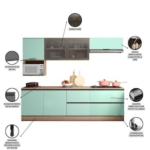 Cozinha Modulada Completa 7 pecas 7 portas 4 gavetas com balcao para cooktop Etna e um produto com toda praticidade e elegancia para seu ambiente. Possui modulos amplos com prateleiras, nicho para micro-ondas A.39 x L.55 x P.45cm., aereo com portas molduradas com vidro fume, aereo geladeira com pistao a gas, balcoes com tampo de espessura 27mm, resistente a riscos, umidade e altas temperaturas, balcao com gaveta embutida com porta talher incl, balcao 1 porta 1 gaveta ideal para cooktop (instrucoes de recorte no manual de montagem), dobradicas reforcadas de 35mm com a funcao slow motion possibilitando um fechamento mais suave, gavetas com corredicas telescopicas que permitem abertura total, puxadores modelo perfil em polimero preto nos balcoes e puxadores slim metal nos aereos, pes em PVC 14,5cm regulaveis ao piso que permitem o nivelamento perfeito, tambem acompanha rodapes com presilhas modelo click que possibilitam a remocao dos mesmos. Conjunto composto por 7 itens: aereo 1porta, nicho micro-ondas, aereo 2portas vidro, aereo geladeira, balcao 1porta com tampo, balcao 1porta 3gavetas com tampo, balcao 1porta 1gaveta com tampo. Produto em MDP com pintura UV acetinada, possibilitando melhores acabamento e resistencia. Produto ecologicamente correto com embalagens preparadas para evitar s e permitir que o produto chegue em perfeito estado em sua casa. Perfeita combinacao com os mais variados ambientes. Qualidade que so a Poliman oferece em seus produtos.