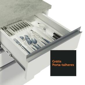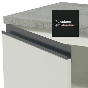 O acabamento da cozinha é branco, feito em Pintura Poliéster com 7 camadas que protegem o móvel dos efeitos do álcool da água e do calor.