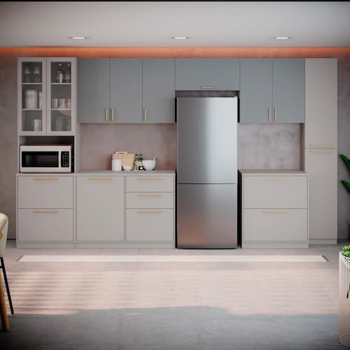 puxadores em alumínio com ABS proporcionam pegada confortável e resistente, enquanto as gavetas com corrediças telescópicas garantem abertura suave e silenciosa. O resultado é uma cozinha moderna, funcional e pensada para facilitar sua rotina.