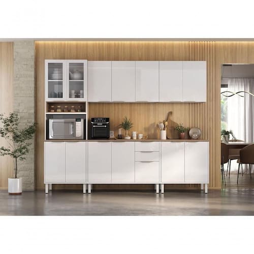 Composta por 5 peças, a cozinha inclui duas portas de vidro, que trazem leveza e sofisticação ao ambiente, além de facilitar a visualização dos itens armazenados. O paneleiro conta com um espaço dedicado especialmente para o forno, otimizando o uso do espaço e proporcionando uma solução inteligente para quem deseja mais funcionalidade.
