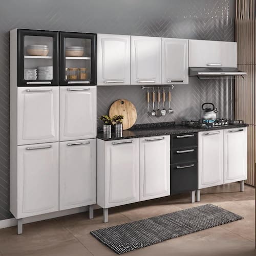 Cozinha Completa Itatiaia Tarsila 280cm Em Aço Branco/preto A Cozinha Completa Itatiaia Tarsila 280cm em Aço Branco/Preto combina sofisticação e praticidade com um visual moderno e impactante. Produzida em aço com pintura eletrostática a pó, ela oferece alta durabilidade e um acabamento impecável. Os puxadores em alumínio com ponteiras em ABS cromado elevam o visual, trazendo um toque refinado e atual. Características principais: Estrutura em Aço com Pintura Eletrostática: Alta durabilidade, resistência e fácil limpeza. Puxadores em Alumínio com Ponteiras Cromadas: Design elegante e robusto. Dobradiças 35mm Slow Motion: Fechamento suave e silencioso, com aquele toque de conforto. Tampo Reto de 25mm com Revestimento em Fórmica: Ideal para quem busca durabilidade e beleza. Balcão de 80cm para Cooktop: Recorte padronizado, com os cooktops de 5 bocas Itatiaia. Combinação de Cores Branco/Preto: Estilo versátil que se adapta a diferentes decorações. É mais que uma cozinha é um espaço inteligente, bonito e pronto pra acompanhar sua rotina com estilo. Linha: Tarsila | Cor: Branco/Preto | Cores: Branco | Setor: Aço | Situação do Produto Enviado: e desmontado na caixa | Acompanha Manual de Instalação: Sim | Recomendações Montagem: Seguir orientação de montagem conforme manual que vai junto ao produto e fixá-lo na parede. | Recomendações de Uso, Manutenção e Limpeza: Pano levemente umedecido com sabão neutro. | Garantia: 12 meses | Material predominante: Aço | Altura: 190 a 210 cm | Profundidade: 45 a 60 cm | Largura: 210 a 300 cm | Pode vender individualmente?: Sim | Complexidade da montagem: Vide Manual | Necessita Montagem: Sim | Montagem e Montador: Não Inclusos