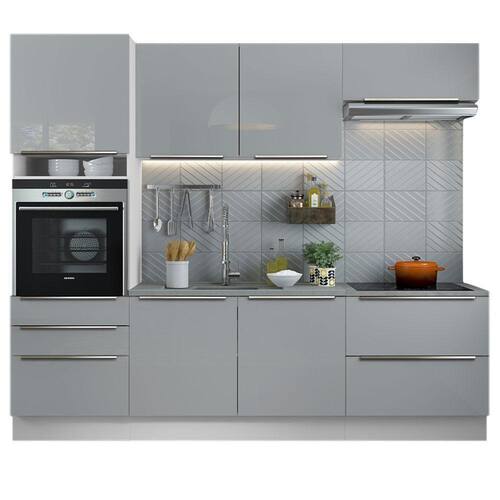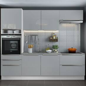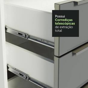 O acabamento da estrutura é branco e as portas e frentes das gavetas são cinzas. A Pintura em Poliéster Protetor consiste na aplicação de 7 camadas de proteção resistentes a álcool, água e calor.