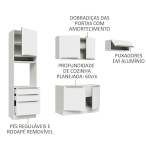 Para completar, todos os puxadores são em alumínio, mais resistentes ao uso diário e os pés dos balcões são reguláveis em PVC, com rodapé removível em MDP para facilitar na hora de fazer a limpeza.
