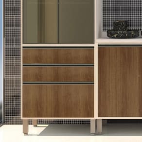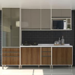 A Cozinha Completa Línea Luciane é pra você que tem um espaço reduzido mas não abre mão de uma cozinha moderna. Uma cozinha planejada, linda para deixar seu ambiente super-requintado. Composta por 5 peças especialmente pensada para sua organização, contém 01 Paneleiro Torre, 01 Armário Aéreo de 1,20 m, 01 Armário Aéreo de 0,80 m e 02 Balcões. As 11 portas embutidas remetem um acabamento impecável e possuem dobradiças reforçadas de 35 mm com amortecimento slow, que garante uma abertura e fechamento mais seguro e suave. A cozinha modulada completa conta com 4 gavetas e 02 gavetões com amplo espaço interno, que oferece a praticidade para guardar todos seus mantimentos. As gavetas com corrediças telescópicas em dois estágios de abertura, são firmes e você pode abri-las completamente sem que a gaveta caia. O Paneleiro Torre contém 2 portas, 2 gavetas e 01 gavetão, as 02 portas são de vidro reflecta na cor bronze e perfil de alumínio, que é a junção de elegância e sofisticação. O Armário Aéreo de 1,20 m possui 3 portas, que permite guardar suas louças preferidas, além de ser muito resistente. O Armário Aéreo de 0,80 m vem com 01 porta basculante e pistão amortecedor, que facilita a abertura e freia o fechamento tornando-os mais leves. Ainda conta com nicho para forno micro-ondas ou eletrodomésticos e nichos feitos com espaço para colocar seus objetos de decoração. O balcão completo é formado por 02 módulos e possui no total 4 portas, 2 gavetas e 1 gavetão. O seu tampo em BP na cor mármore, produzido com um material resistente a riscos, que não descasca e ainda transmite beleza ao ambiente. A Cozinha Completa Línea Luciane é fabricada com estrutura em madeira MDP de 15 mm, extremamente reforçada e que evita o empenamento. Todos os puxadores são tipo gola em perfil de alumínio inox, com acabamento de proteção PS, um modelo inovador, que traz um design moderno e sofisticado, com alta qualidade nos acabamentos. Os pés em PS na cor bege com regulagem de altura, possibilitam um nivelamento perfeito, estabilidade e agilidade na limpeza da sua cozinha modulada. Conte com um armário de cozinha completo onde os módulos são montados individualmente e permite a instalação da forma que melhor se adéque ao seu espaço.