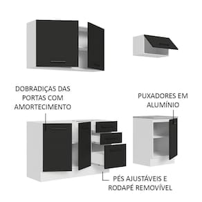 Com fabricação seguindo os padrões mais altos de qualidade, a cozinha conta com puxadores com alça em alumínio, gavetas com corrediças telescópicas de abertura total e portas com amortecimento para fechamento suave.