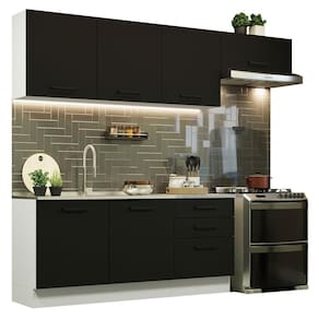 Por se tratar de uma cozinha modulada, permite que você organize os armários e balcões seguindo o espaço necessário do seu ambiente. Com isso, se torna praticamente uma cozinha planejada.