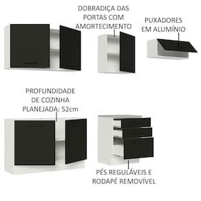 O acabamento da estrutura é branco e as portas e frentes são pretas. É feito em Pintura Poliéster ecológica com sete camadas, que destaca a tonalidade e protege o móvel.
