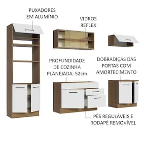 Os materiais utilizados na fabricação são de padrão superior, como os puxadores com alça em alumínio, gavetas com corrediças telescópicas de abertura total, vidros reflex no aéreo e as portas com amortecimento para fechamento suave.