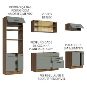 Os materiais utilizados na fabricação são de padrão superior, como os puxadores com alça em alumínio, gavetas com corrediças telescópicas de abertura total, vidros reflex no aéreo e as portas com amortecimento para fechamento suave.