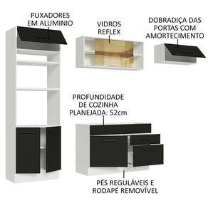 Fabricada com alto padrão de qualidade, possui puxadores com alça em alumínio, gavetas com corrediças telescópicas de abertura total, vidros reflex no aéreo e as portas com amortecimento para fechamento suave.