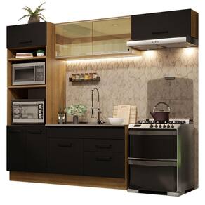 Fabricada com alto padrão de qualidade, possui puxadores com alça em alumínio, gavetas com corrediças telescópicas de abertura total, vidros reflex no aéreo e as portas com amortecimento para fechamento suave.