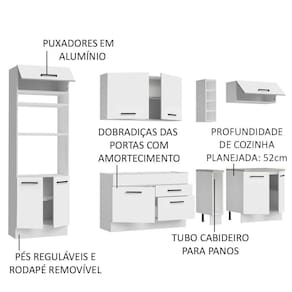 Os materiais utilizados na fabricação são de alta qualidade, como gavetas com corrediças telescópicas e portas com amortecedor para fechamento suave. Já os puxadores possuem alças metálicas, mais resistentes ao uso diário.
