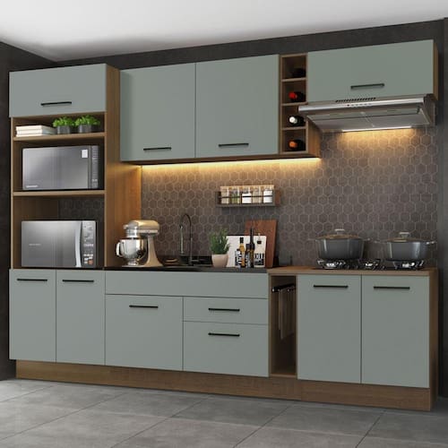 Esta versão é super completa e conta com torre-quente com espaço para forno e micro-ondas, além de adega e balcão porta-pano. A torre também permite a instalação de forno embutido. O balcão de pia no tamanho de 120 x 52 cm suporta pias de inox e pedra e o balcão de 80 cm acompanha tampo, que pode ser recortado para colocação de cooktop.