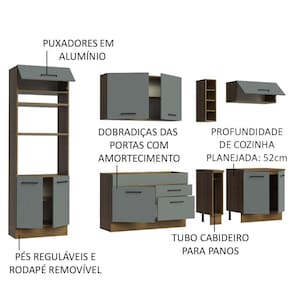 Para completar, os módulos inferiores contemplam pés reguláveis em PVC e rodapé removível em MDP, pensado para facilitar a limpeza.