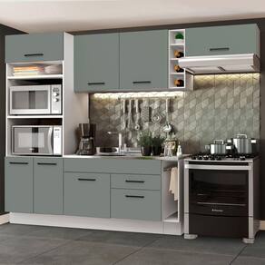 O acabamento da estrutura é branco e as portas e frentes são cinzas. É feito em Pintura Poliéster ecológica de alta resistência, que protege o móvel dos efeitos da água e do calor.