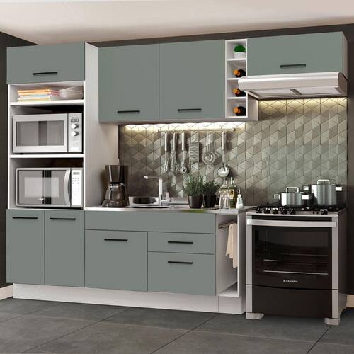 A linha de Cozinhas Agata da Madesa têm como grande diferencial os itens de qualidade superior, como gavetas com corrediças telescópicas, portas com amortecedor para fechamento suave e puxadores pretos com alças metálicas.
