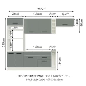 Neste modelo, possui torre quente com capacidade para forno e micro-ondas, além de adega e balcão porta-panos e armários aéreos espaçosos O balcão de pia no tamanho de 120 x 52 cm suporta pias de inox e pedra.