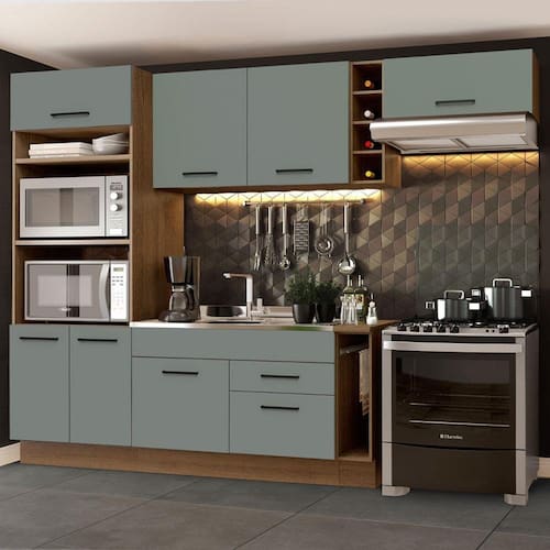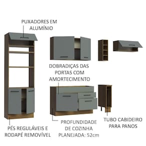 Itens inclusos: - Uma (1) Torre quente com nichos para forno e micro-ondas e três (3) portas sendo uma (1) basculante - Um (1) Balcão de pia com duas (2) gavetas e uma (1) porta (Não acompanha tampo) - Um (1) Balcão Porta-panos com tampo Rustic - Um (1) Aéreo com duas (2) portas - Uma (1) Adega - Um (1) Aéreo com uma (1) porta basculante