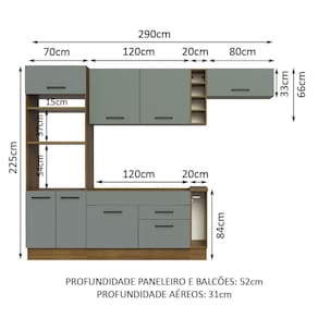 Neste modelo, possui torre quente com capacidade para forno e micro-ondas, além de adega e balcão porta-panos e armários aéreos espaçosos O balcão de pia no tamanho de 120 x 52 cm suporta pias de inox e pedra.