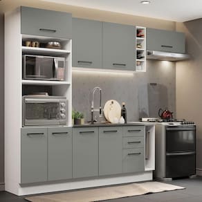 Com ótimo espaço interno e externo, conta com diversas gavetas, prateleiras e nichos, perfeitos para organizar os utensílios e louças. Possui lugar também para forno e micro-ondas e permite a instalação de forno embutido.