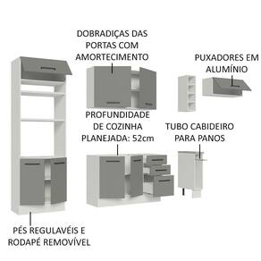 Os materiais utilizados na fabricação são de alta qualidade, como os puxadores com alça em alumínio, as gavetas com corrediças telescópicas de abertura total e as portas com amortecimento para fechamento suave.