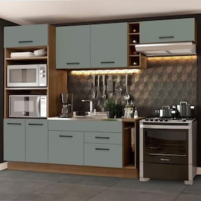A linha de Cozinhas Agata da Madesa têm como grande diferencial os itens de qualidade superior, como gavetas com corrediças telescópicas, portas com amortecedor para fechamento suave e puxadores pretos com alças metálicas.
