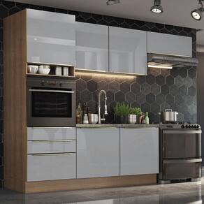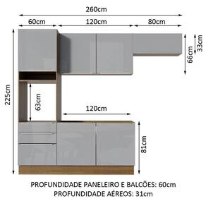 As medidas totais da cozinha são: 260 cm de largura x 225 cm de altura. A profundidade é de 60 cm nos módulos inferiores e 31 cm nos aéreos. O balcão comporta pias de 120 cm x 60 cm. Não acompanha tampo.