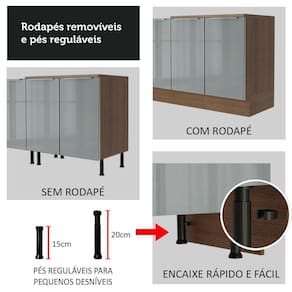 Para completar, todos os puxadores são em alumínio, mais resistentes ao uso diário e os pés dos balcões são reguláveis em PVC, com rodapé removível para facilitar na hora de fazer a limpeza.