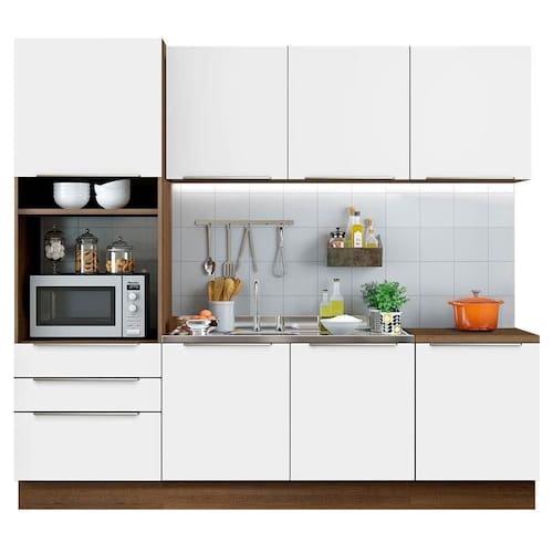 Com ótimo espaço interno, possui profundidade de cozinha planejada: 60 cm. São diversas portas, gavetas, prateleiras e nichos, perfeitos para organizar todos os utensílios da cozinha.