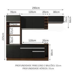 Outro grande diferencial desta cozinha é a profundidade maior, como uma cozinha planejada: 52 cm no balcão inferior e 31 cm nos aéreos. As medidas totais são: 290 cm de largura e 225 cm de altura.