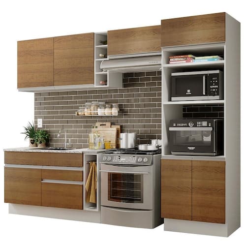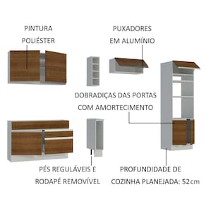 As gavetas contam com corrediças telescópicas e todas as portas possuem dobradiças com amortecimento para o fechamento suave. Além disso, todos os módulos são separados, assim você tem a possibilidade de montar a cozinha dos seus sonhos, conforme a necessidade do seu espaço.