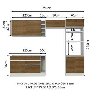 As medidas totais da cozinha são: 290 cm de largura x 225 cm de altura. A profundidade é de 52 cm nos balcões e no paneleiro e 31 cm nos aéreos.