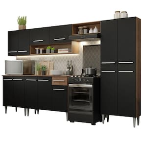 O acabamento da cozinha combina os tons amadeirado Rustic e preto. O processo é feito em Pintura Poliéster ecológica com 7 camadas que protegem contra os efeitos da água e do calor.